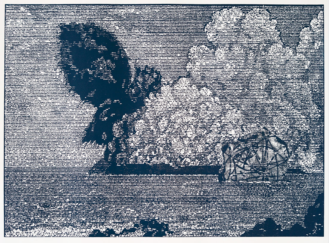 Et eksplosivt vulkanutbrudd, dannelsen av en ny øy og ny jordskorpe. Svensen er fascinert av denne dobbeltheten mellom det skapende og det ødeleggende. Jordens skorpe befinner seg i et evig kretsløp og brytes ned, ødelegges, og oppstår igjen ved hjelp av vulkaner. Motivet er håndtegnet på kryssfiner, noe som gjelder for alle tresnittene hans.